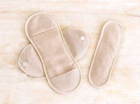 ボタン以外は縫製糸も全部オーガニックコットンでとても丈夫。本体のポケットにパッドをさしこむことで、ずれてしまったり交換のとき落とす心配がありません。表面はさらりと快適な平織生地を使用。ポケット部分もやわらかで自然になじむ着け心地です。きなりは白いコットン、茶は茶色のコットンを使用した天然のやさしい色合いです。