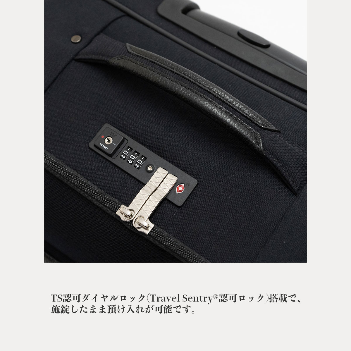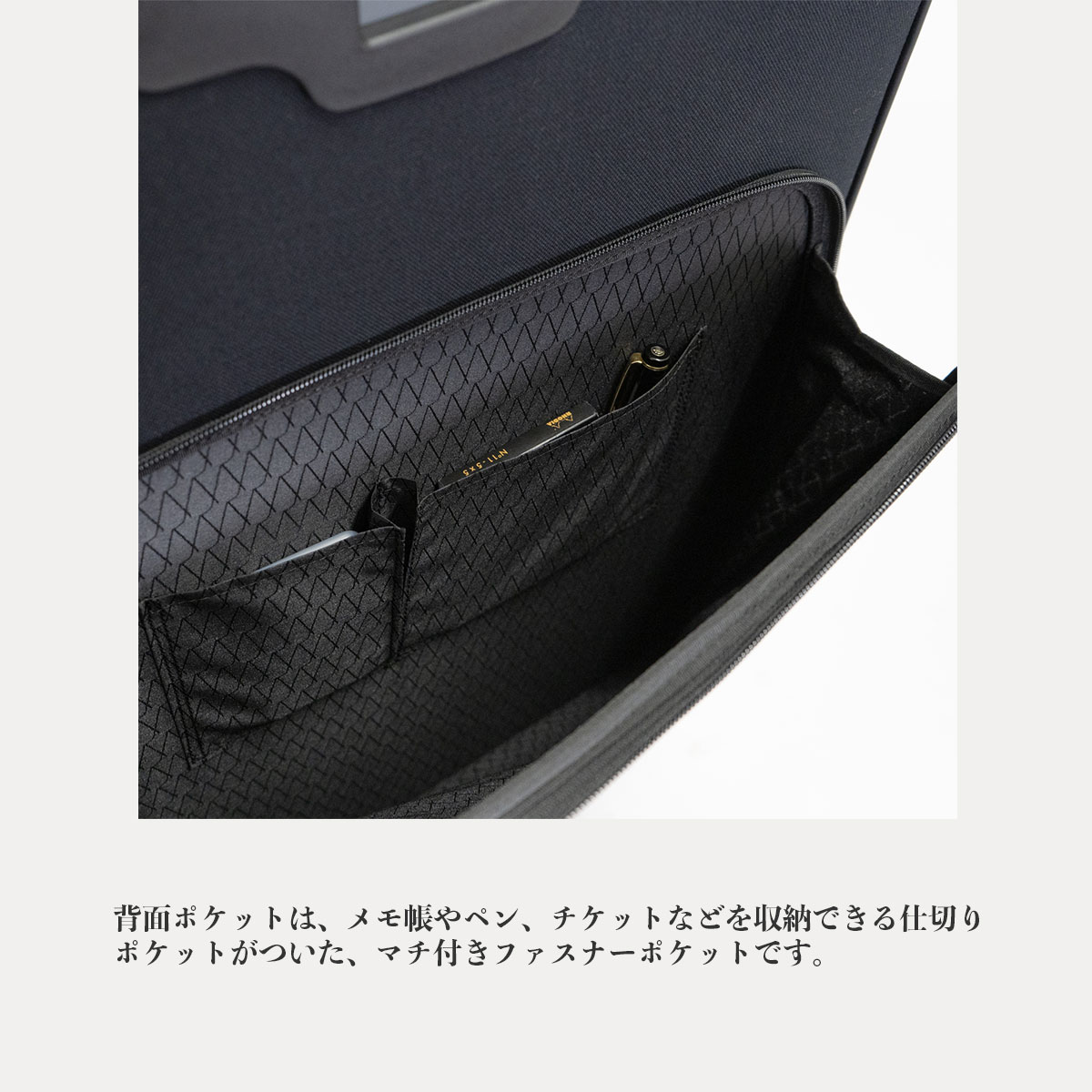 スーツケースを立てたまま電車内で荷物を取り出す際に実用的なファスナーポケット付き仕切りを内装に配しています。