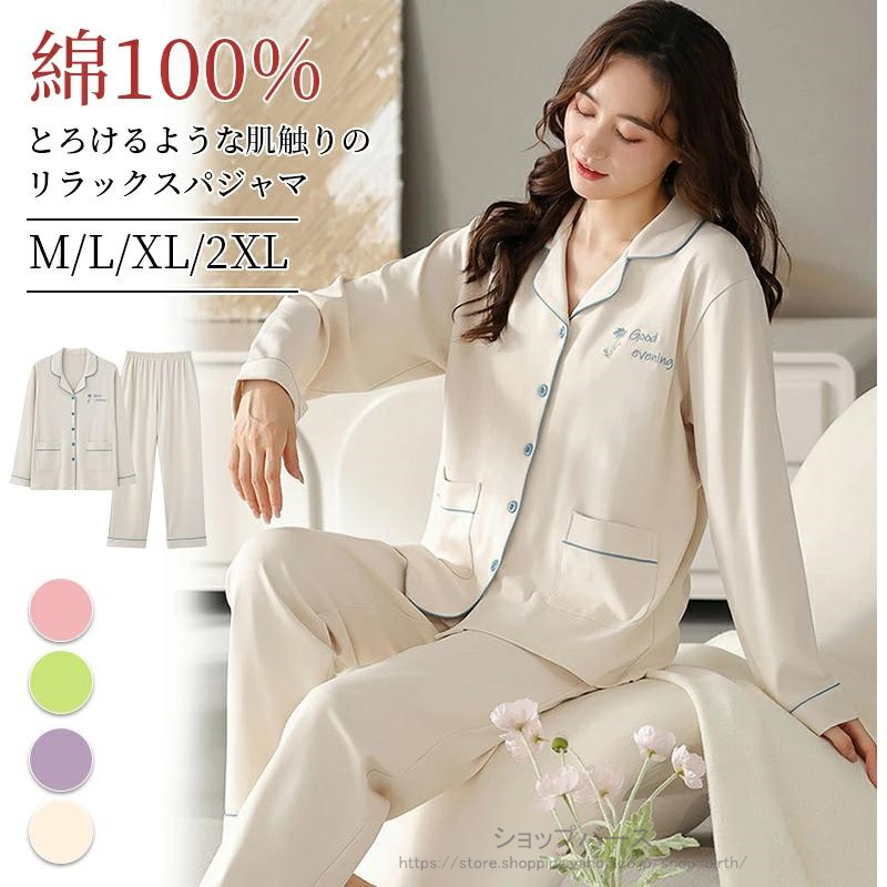 パジャマ 綿100% 上下セット レディース 前開き ルームウェア ナイトウェア 冷感 通気 吸湿 寝巻き トップス ボトムス 長袖 春 夏 秋 カジュアル ゆったり