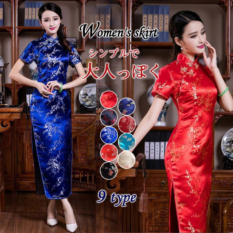 ロング丈のチャイナドレスは、全体的に優雅で上品な印象を与えます。