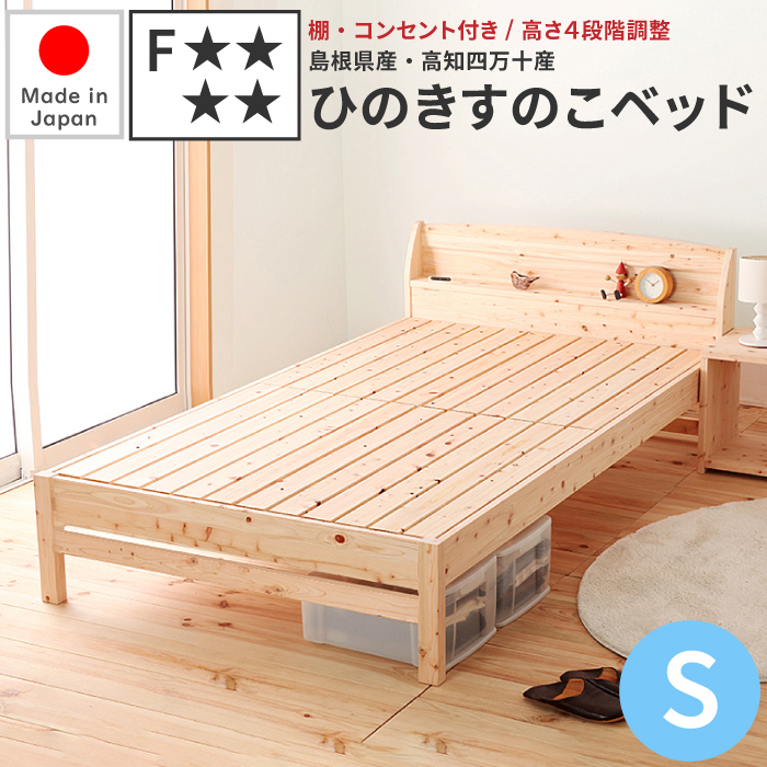 画像はシリーズ・バリエーション等も掲載している場合がございます。本商品は 【棚・コンセント付き 島根県産・高知四万十産 ひのきすのこベッド シングル】 の販売ページです。