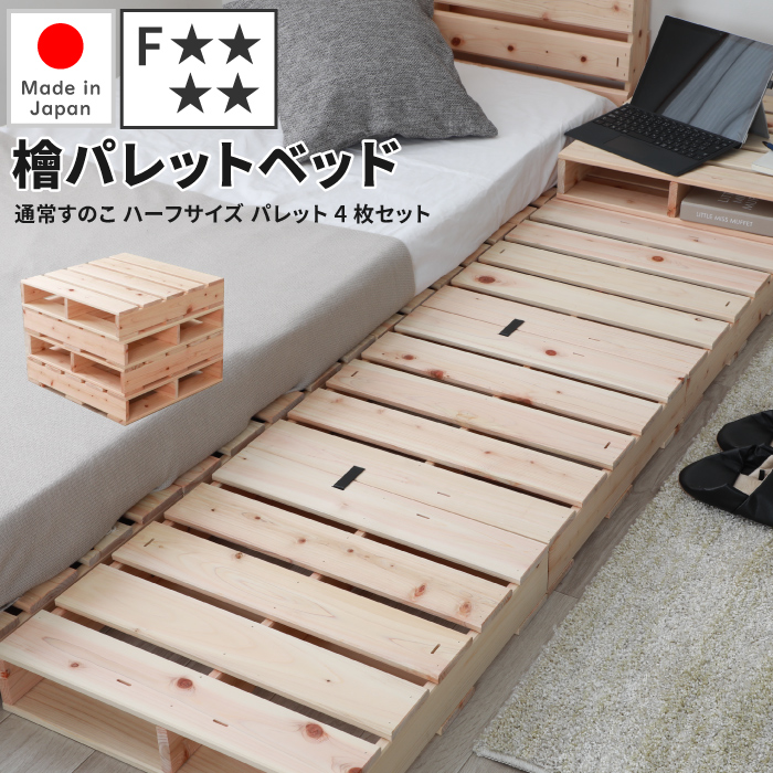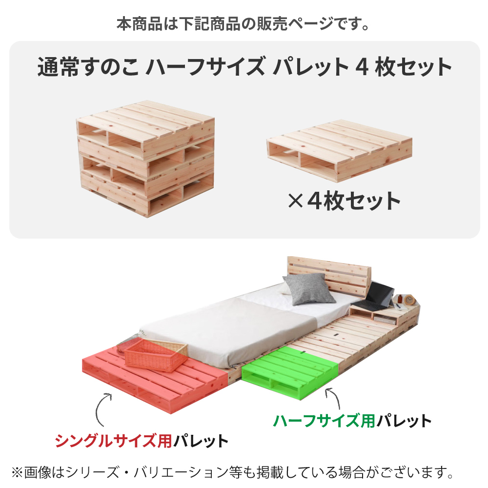 画像はシリーズ・バリエーション等も掲載している場合がございます。本商品は 檜パレットベッドパーツ 通常すのこ ハーフサイズ パレット4枚セット の販売ページです。