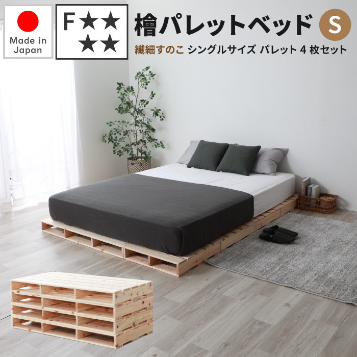 画像はシリーズ・バリエーション等も掲載している場合がございます。本商品は 檜パレットベッド 繊細すのこ シングルサイズ パレット4枚セット の販売ページです。