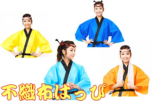 不織布はっぴはイベントや余興、文化祭、展示会・等には大変好評です。くり返しご使用する事も出来ます。低価格でご利用しやすいと思います。素材は、不織布ですから布製やサテン生地に比べますと少しバりとした感じです。汚れましたら軽く手洗いして下さい。大事にご使用すればくり返し何回もご使用頂けます。多少の撥水効果もございます。アイロンは使用出来ませんのでご注意下さい。