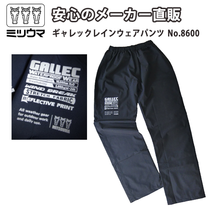 ミツウマ 合羽 ギャレックレインウェア パンツ No.8600 防水 撥水 ストレッチ素材 透湿 防風 反射 漁業 水産業 釣り