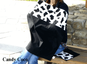 授乳カバー/授乳ケープ(ナーシングケープ)表地:モウモウ×黒のツートン、裏地:黒。キャンディココのおしゃれな授乳カバーはおそろいのポーチ付。小物ポーチとしても愛用できます。形状記憶ワイヤー入りで赤ちゃんの顔を見ることができます。首周り、左右(横風防止)は金具でリボンの長さを自由に調節できます。ケープ縦65×横86cm、表・裏:綿100%、リボン:ポリエステル100%形状記憶ワイヤー入り(洗濯可能)。ポーチ縦26×横20cm、表・裏:綿100%・お洗濯は金具やワイヤーを整えてネットに入れ手洗い又はやさしく洗ってください。・首周りのリボンなど赤ちゃんの安全のため取り扱いには十分ご注意下さい。出産後の産後用品として出産祝いにもおすすめ。