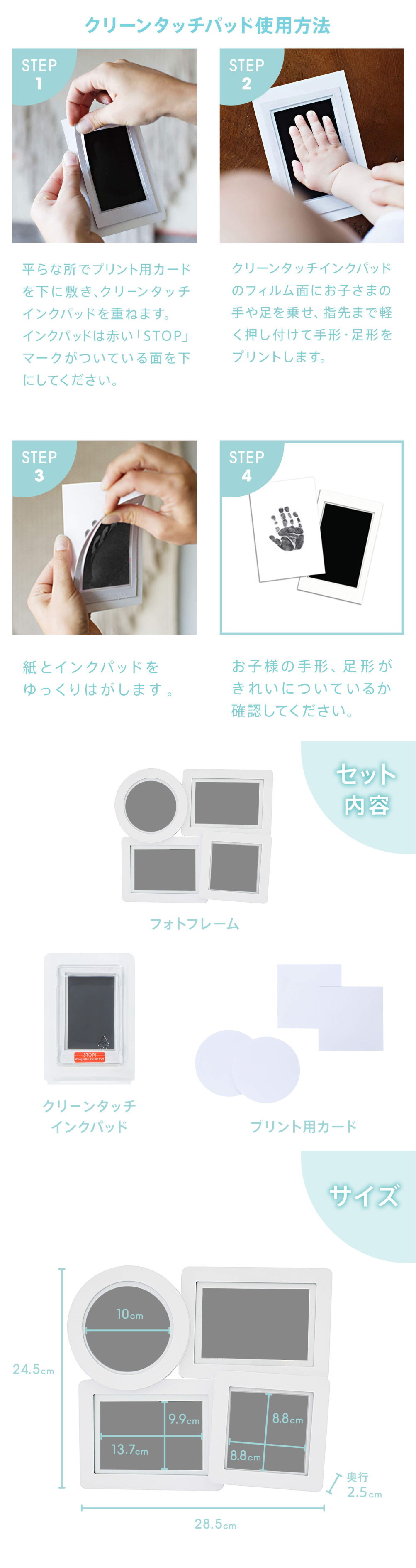 付属のクリーンタッチインクパッドでお子さまの手や足に直接インクをつけずに手形・足形がとれるので、赤ちゃんの手足を汚さず安心です。