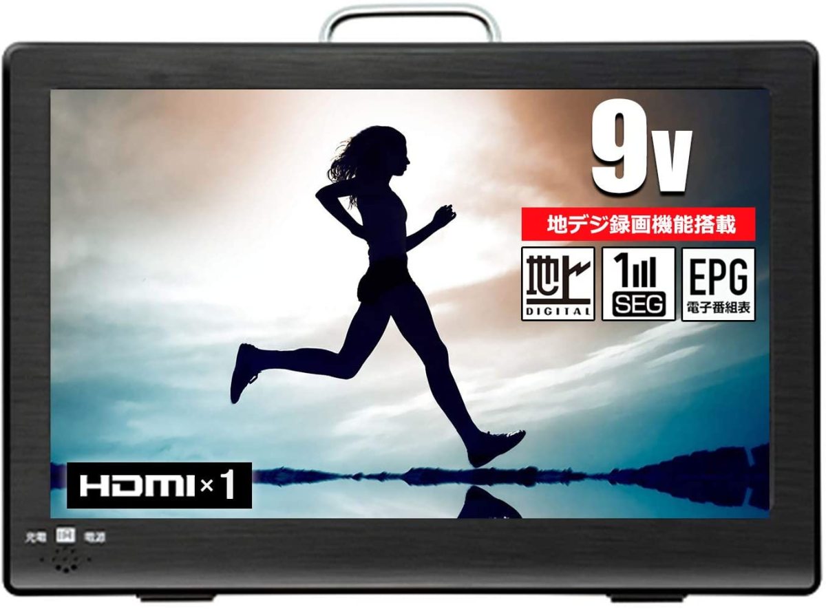 地デジが観れて録画が出来る!バッテリー内蔵【9インチ録画機能付きポータブルTV】■USBメモリやハードディスクを接続してテレビ番組の録画が可能です!動画・音声・画像ファイルの再生も可能!■壁掛け・スタンド置き・車載の3WAY STYLEで様々な場所で楽しめます!■3電源対応(充電式・CAR・AC)で、車内・アウトドア等、様々なシーンで大活躍!■【フルセグ地デジ】&【ワンセグ】自動切り替え外形寸法:約(幅)226×(奥行)24.5×(高さ)152mm本体質量:約510gパッケージサイズ:約334×86×182mmカートンサイズ:約542×350×202mm電源:ACアダプター 入力AC100-240V 50/60Hz 出力DC12V 1.5A内蔵充電池(バッテリー):DC7.4V/mAh充電時間:約5時間(電源切状態)フルセグ放送連続視聴時間:約2時間待機消費電力:<1W受信周波数:UHF放送13-62ch ※ワンセグ放送対応許容温度範囲:5℃-35℃リモコン到達距離:3m以内(本体リモコン受光部正面から)消費電力:18W(ACアダプター使用時)■素材・成分:入力端子:アンテナ入力端子、miniB-CASカードスロット、USB端子(録画用)イヤホン端子、AV入力端子、HDMI端子、USB端子(再生用)対応フォーマット:ビデオ AVI、MPEG4、MKV、MOV、VOB、RM/RMB音声 MP3、WMA、m4a、aac画像 JPEG、JPG、BMP、PNG、TXT液晶パネル:タイプ a-Si TFT-LCDサイズ 9インチフレームレート 60Hzアスペクト比 16:9解像度 1024×600画素コントラスト比 400:1(Yyp.)(TM)輝度 120cd/m2応答速度 3/7(Typ.)(Tr+Td)ms視野角 40/40/15/30(MIn.)(CR≧10)付属品:リモコン、リモコンテスト用電池(CR2025)、ACアダプターカーアダプター、ワンセグ用アンテナ、AVケーブル、イヤホンminiB-CASカード、車載用バック、取扱説明書兼保証書