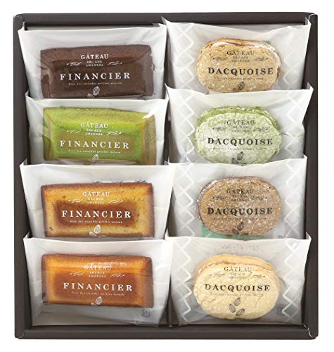 「商品情報」本場カリフォルニア産のアーモンドを菓子職人が丁寧に自家挽きして使用しています。アーモンドの約半分は油脂で出来ています。油脂は空気に触れると参加は進み、本来の美味しさを無くしてしまいます。同工場で挽かれたアーモンドを使用し素材と製法にこだわった、本格ガトーセレクションです。フィナンシェはしっとり、ダックワーズはもっちり食感が続くのに日持ちが長く、贈り物にも最適です。「主な仕様」原材料:【ダックワーズキャラメル】液卵白(卵を含む、国内製造)、砂糖、アーモンド、準チョコレート(乳成分を含む)、小麦粉、カラメルペースト、乾燥卵白、でん粉、粉末水あめ、食塩/トレハロース、セルロース、カラメル色素、香料、乳化剤(大豆由来)、環状オリゴ糖 【ダックワーズ抹茶】液卵白(卵を含む、国内製造)、砂糖、アーモンド、準チョコレート(乳成分を含む)、小麦粉、抹茶、乾燥卵白、でん粉、粉末水あめ、ほうじ茶粉末、食塩/トレハロース、セルロース、クチナシ色素、乳化剤(大豆由来)、環状オリゴ糖、香料 【ダックワーズカフェ】液卵白(卵を含む、国内製造)、砂糖、アーモンド、準チョコレート(