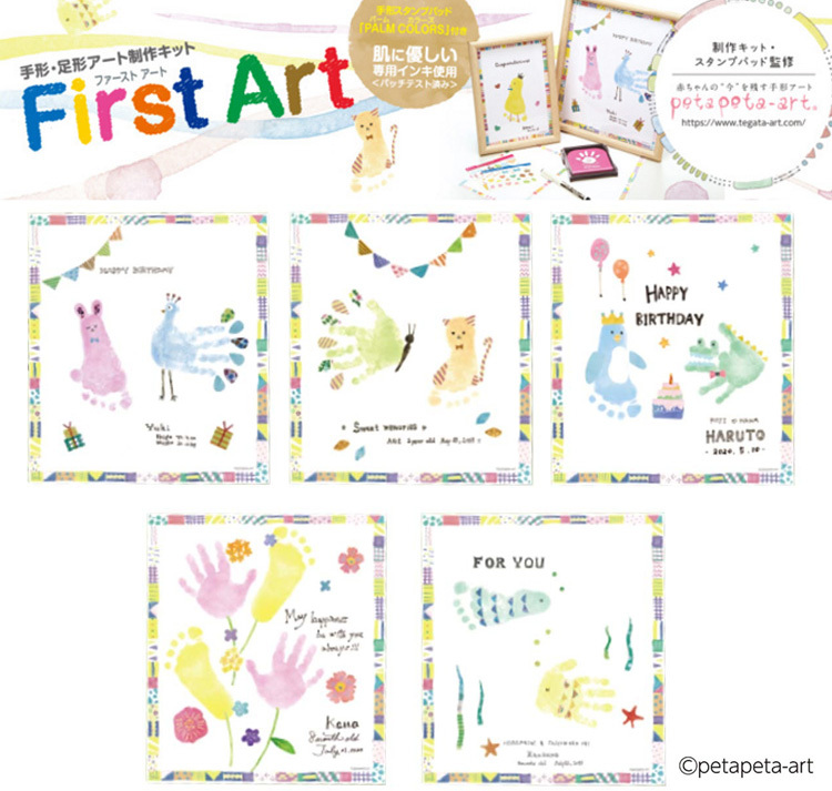 カラフルな手形や足形のスタンプをシールやペンで装飾して、世界に一つだけの作品を作る手形アート制作キット。