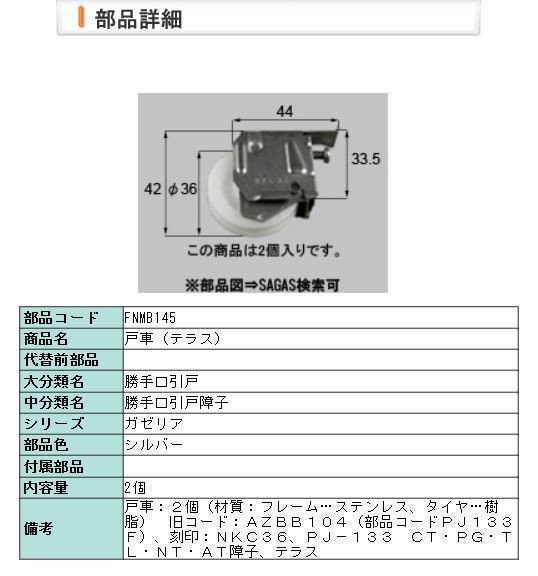 FNMB145 トステム ガゼリア 勝手口引戸 2個入備考 戸車2個 材質(フレーム→ステンレス 戸車→樹脂)CT・PG・TL・NT・AT障子 テラス