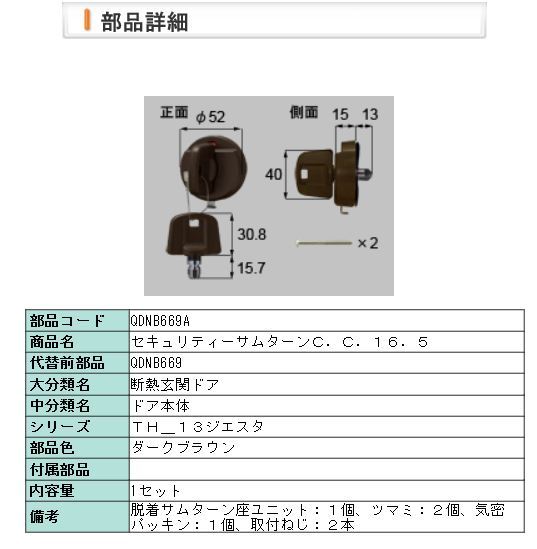 部品コード QDNB669A商品名 セキュリティーサムターンC.C.16.5代替前部品 QDNB669大分類名 断熱玄関ドア中分類名 ドア本体シリーズ TH_13ジエスタ部品色 ダークブラウン付属部品内容量 1セット備考 脱着サムターン座ユニット:1個、ツマミ:2個、気密パッキン:1個、取付ねじ:2本