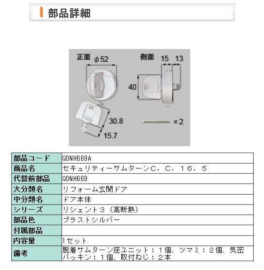 部品コード QDNH669A商品名 セキュリティーサムターンC.C.16.5代替前部品 QDNH669大分類名 リフォーム玄関ドア中分類名 ドア本体シリーズ リシェント3(高断熱)部品色 ブラストシルバー付属部品内容量 1セット備考 脱着サムターン座ユニット:1個、ツマミ:2個、気密パッキン:1個、取付ねじ:2本