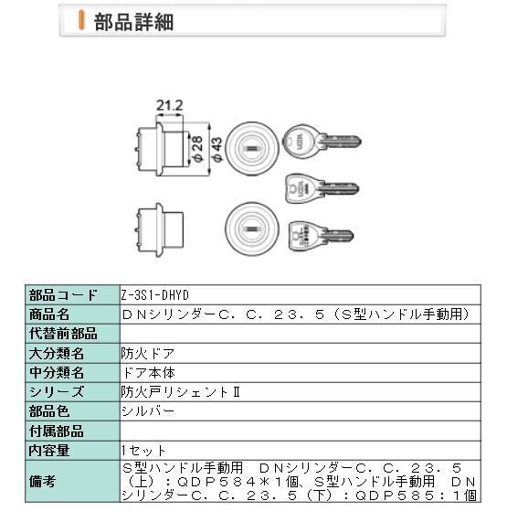 部品コード Z-3S1-DHYD 商品名 DNシリンダーC.C.23.5(S型ハンドル手動用) 代替前部品 大分類名 防火ドア 中分類名 ドア本体 シリーズ 防火戸リシェントII 部品色 シルバー 付属部品 内容量 1セット 備考 S型ハンドル手動用 DNシリンダーC.C.23.5(上):QDP584*1個、S型ハンドル手動用 DNシリンダーC.C.23.5(下):QDP585:1個