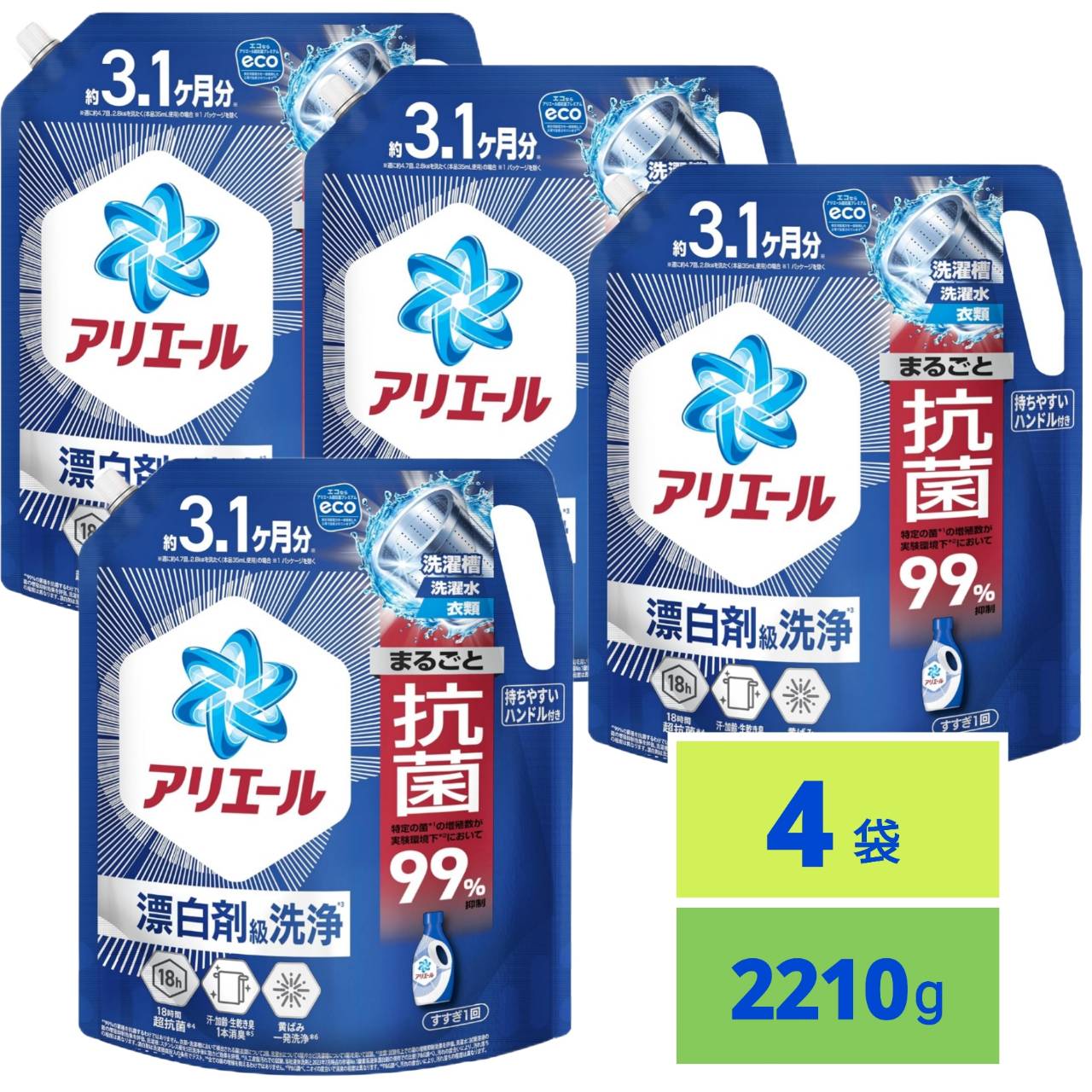 | 主な仕様 | まるごと抗菌 衣類・洗濯水・洗濯槽 *全ての菌の増殖を抑えるわけではありません。万能洗剤 1本で(1)洗濯槽防カビ、(2)つけ置きなしでも蓄積臭はがす、(3)せっけんなしでもシミ一発スッキリ *P&G調べ。ニオイの度合いで消臭の程度は異なります。汚れの度合いにより、汚れ落ちの程度は異なります。カビは除去できません。シャツの汗臭、タオルの生乾き臭、加齢臭 - いろんなニオイを1本消臭 *P&G調べ。ニオイの度合いにより、落ち方の程度は異なります。10%濃縮!同じ洗濯洗剤量で今までより+5枚洗える!*2023年アリエール超抗菌プレミアムシリーズ比。同じ洗濯水量設定の場合。すすぎ1回OK!タテ・ドラム式対応。自動投入洗濯機にも。 |