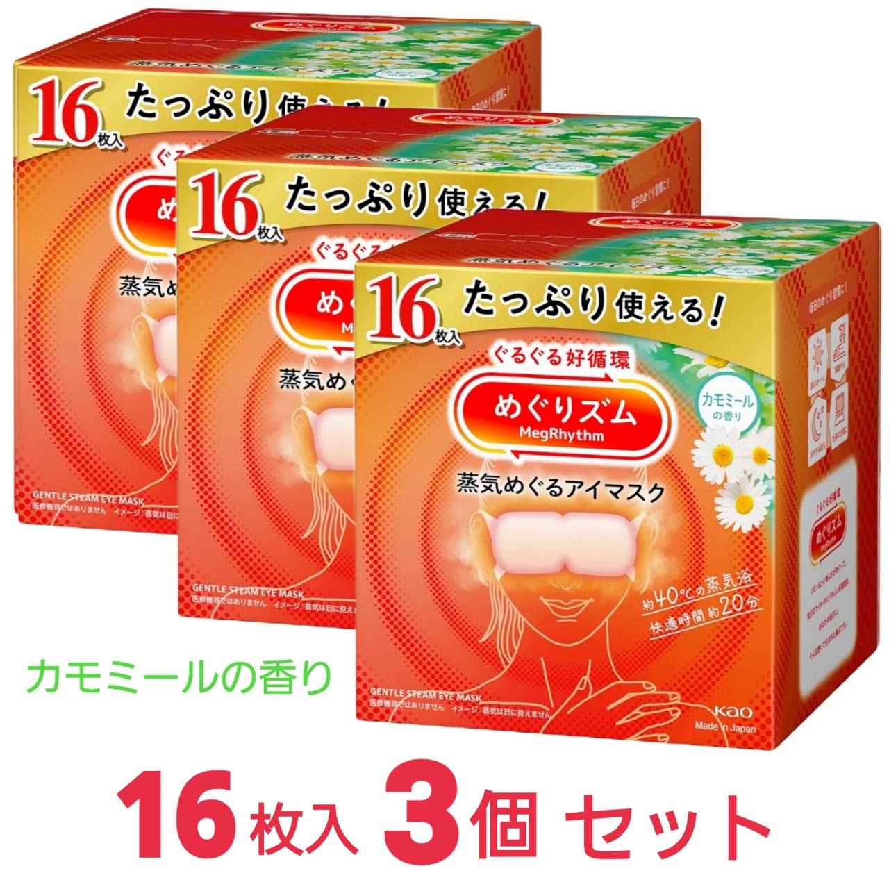 | 主な仕様 | ぐるぐる好循環!蒸気めぐるアイマスク。『蒸気めぐり設計』で気分までときほぐれて心地よさめぐる。お風呂のような心地よさ約40℃。快適時間約20分。蒸気を溜め込む保温性約1.5倍(当社従来品比)極厚やわらか不織布がふくらんで密着フィット●働き続けた目に蒸気をふんだんに●開封するだけで温まる●男女兼用サイズ●カモミールの香り |