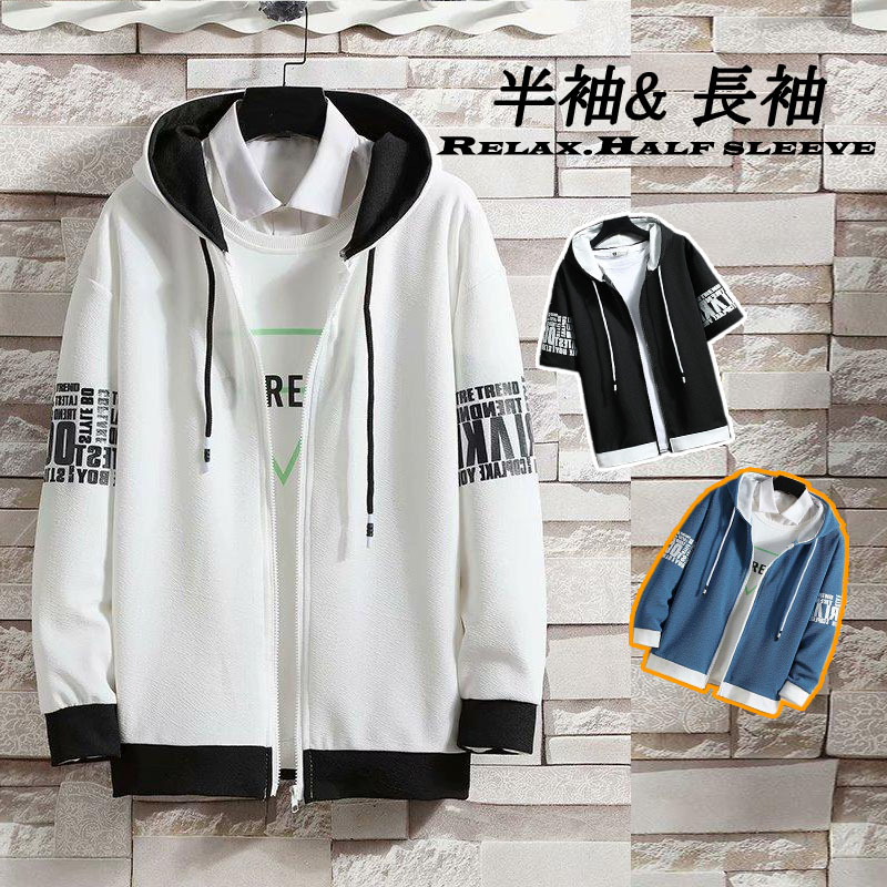 パーカー 切り替え メンズ 秋 夏 春 2TYPE 長袖 半袖 フード付 袖文字 涼しい トップス 薄手 スポーツ 男性用 おしゃれ
