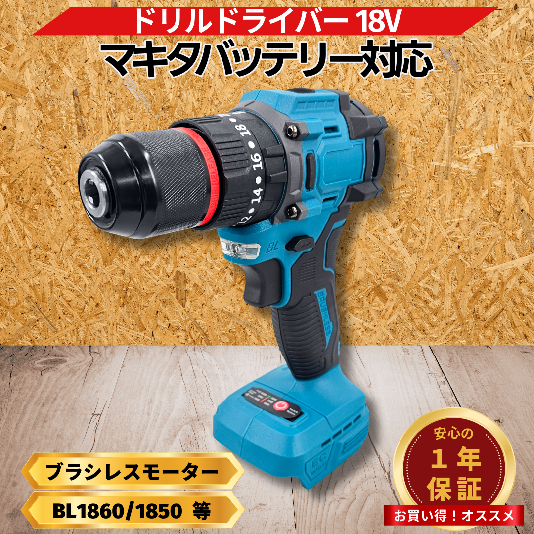 マキタ互換 充電式ドリルドライバー ブラシレスモーター 18V/14.4V対応 20段トルク 3モード切替 LEDライト付 穴あけ/ネジ締め 本体のみ (DRI02-BL)