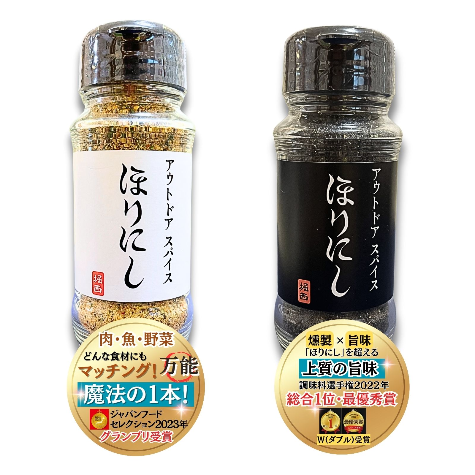 アウトドアスパイスほりにし(白)、ほりにし燻製ブラック(黒)の2種類をお楽しみいただけるセットです。