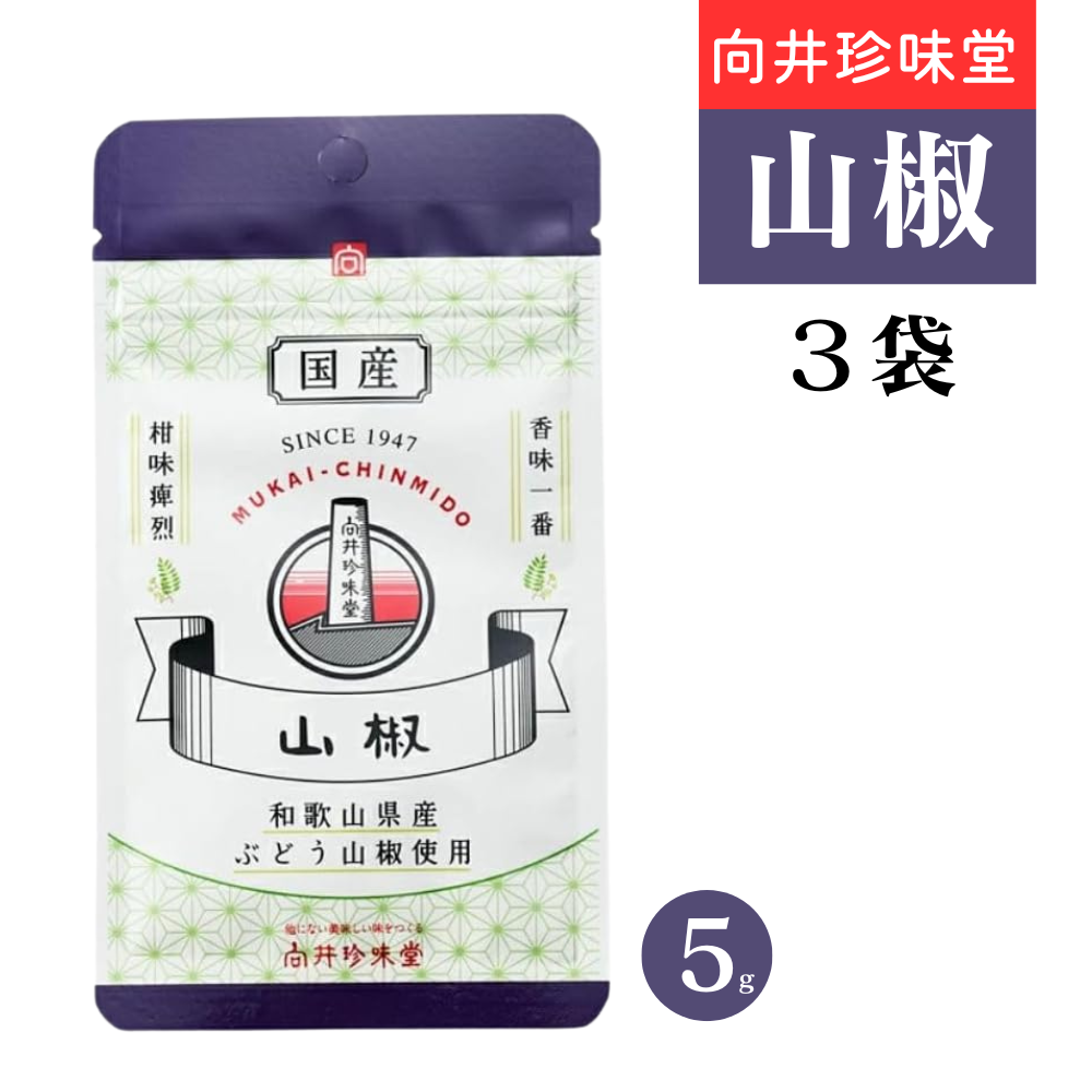 向井珍味堂 山椒 和歌山県産 ぶどう山椒100% 5g 袋入り 便利なチャック付き 粉末 最高 品質 スパイス 粉末 調味料 辛味成分 3袋セット