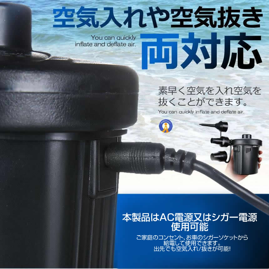 浮き輪、ゴムボート、エアベット、ビニールブールなどに適用します。また、布団や衣替えの真空収納にもお役に立ちます。