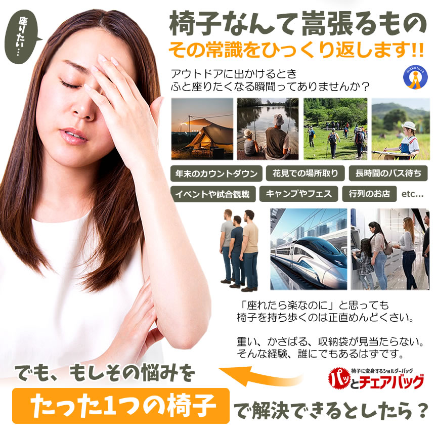 ●ショルダーバッグがそのまま折りたたみ椅子に変身