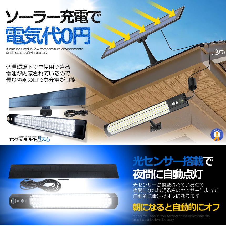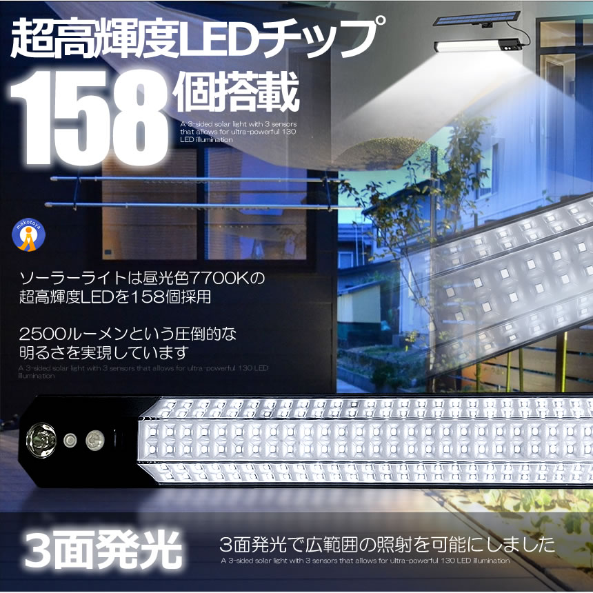 ソーラーライトは昼光色7700Kの超高輝度LEDを158個採用し
