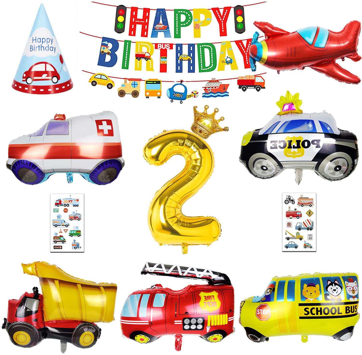 【セット内容】(1)8個のホイルバルーン:【大きめ】トラック×1、【大きめ】飛行機×1、【大きめ】スクールバス×1、【大きめ】パトカー×1、【大きめ】消防車×1、【大きめ】救急車×1、【大きめ】数字バルーン×1、王冠×1 (2)車ステッカー(ランダム 2個) (3) 1セットお誕生日おめでとうバナー (4)説明書(日本語) (5)小道具キット(リボンひも) (6)三角帽子×1