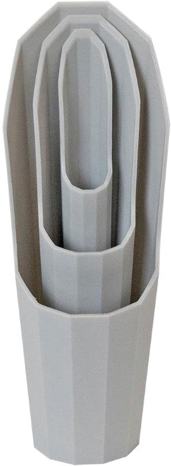 鉢やプランターへの土入れ、多肉植物の植え替え、寄せ植えに。用途に合わせて使える3点セット。大サイズ:鉢やプランターへの土入れに。中サイズ:多肉植物や観葉植物の植え替え作業に。小サイズ:多肉植物の寄せ植えなど、狭い場所への土入れに。十二角形状で持ちやすく、転がりにくい。サイズ(大):全長165mmx径62mm。重量(大):30g。サイズ(中):全長158mmx径40mm。重量(中):24g。サイズ(小):全長152mmx径20mm。重量(小):11g。材質:PP。