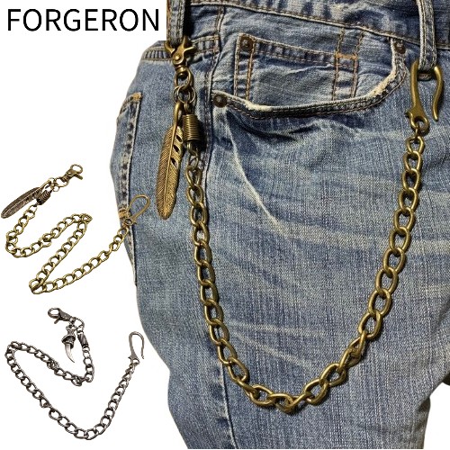 FORGERON ヴィンテージ風ウォレットチェーン 喜平タイプ フェザー ファング ブロンズ シルバー バイカー アンティーク風 財布用チェーン キーチェーン [519R]