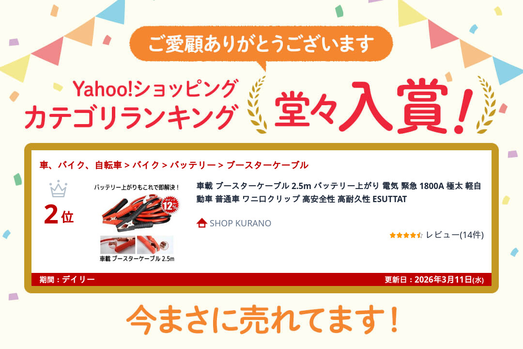 車載 ブースターケーブル 2.5m バッテリー上がり 電気 緊急 1800A 極太 軽自動車 普通車 ワニ口クリップ 高安全性 高耐久性 ESUTTAT