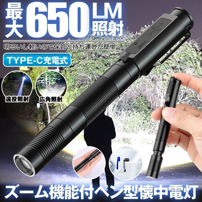 懐中電灯 ハンディライト ペンライト ペン型ライト クリップ led ライト ズーム 防水 ハンディ USB TYPE-C 充電式 作業 防水 小型 持ち運び 軽量