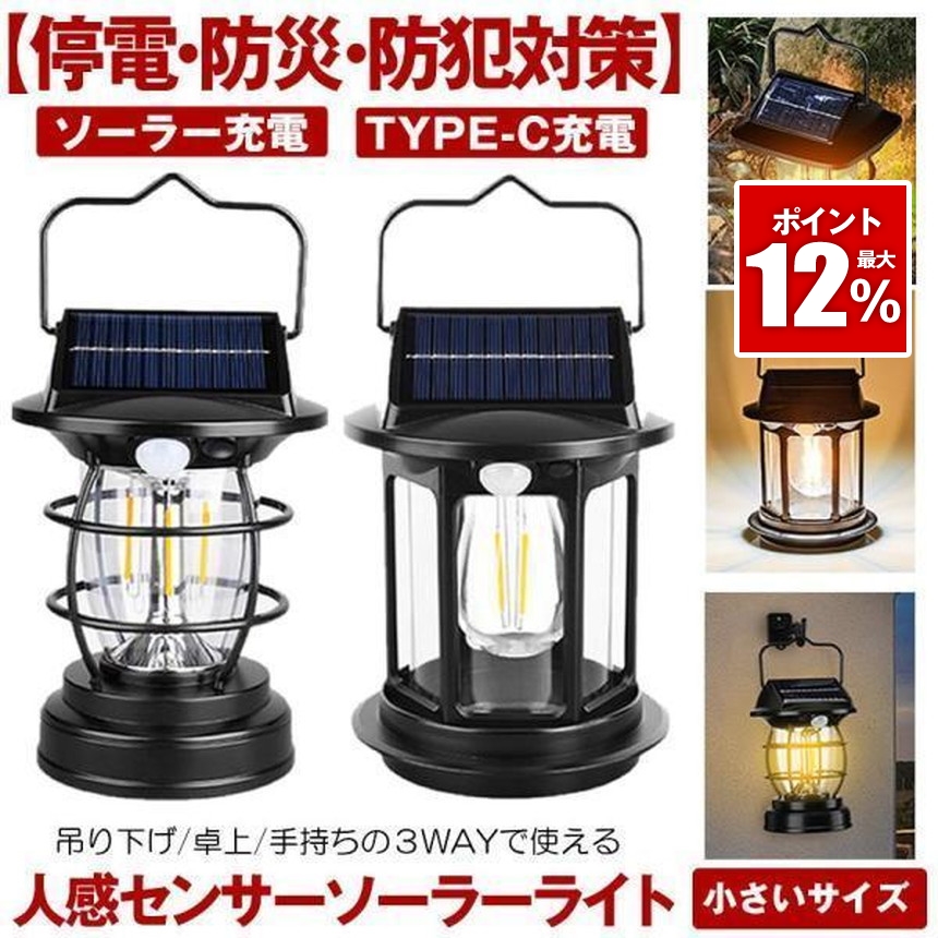 ソーラーライト 屋外 防水 センサーライト ガーデンライト ソーラーランタン ランタン ソーラーセンサーライト 暖色系 TYPE-C 充電式 センサー 防犯ライト 照明