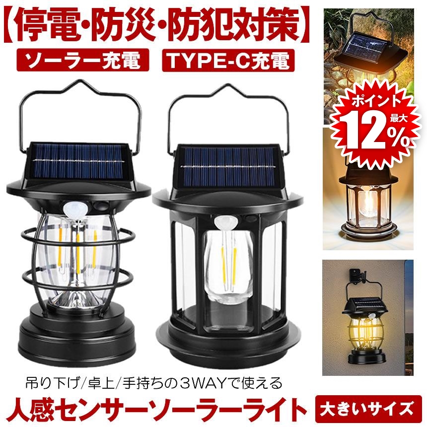ソーラーライト 屋外 防水 センサーライト ガーデンライト ソーラーランタン ランタン ソーラーセンサーライト 暖色系 TYPE-C 充電式 センサー 防犯ライト 照明
