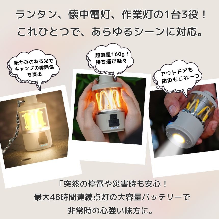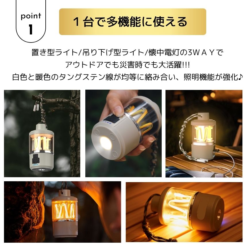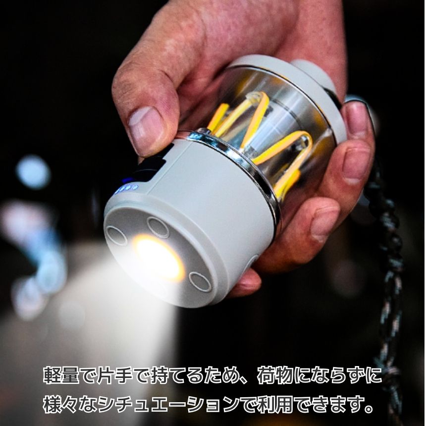 このランタンは、置き型・吊り下げ・懐中電灯として使える多機能デザイン。最新のCOB光源技術を採用し、白色と暖色が均等に絡み合い、