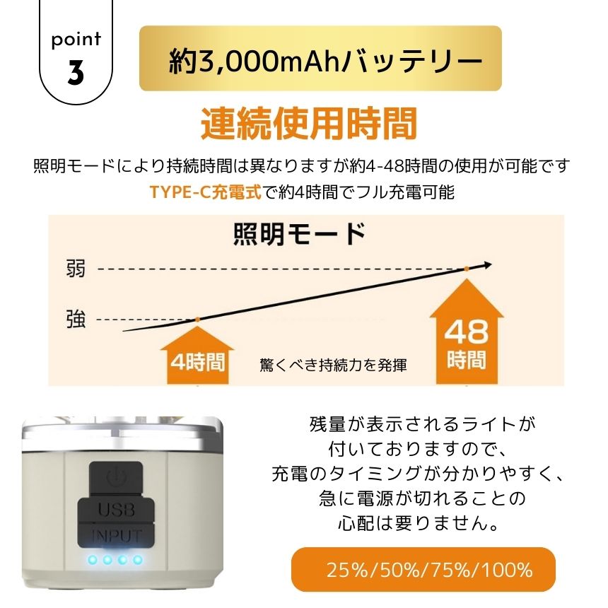 USB充電式&バッテリー残量表示で、3000mAhの大容量バッテリーを搭載し、最大48時間連続使用可能。