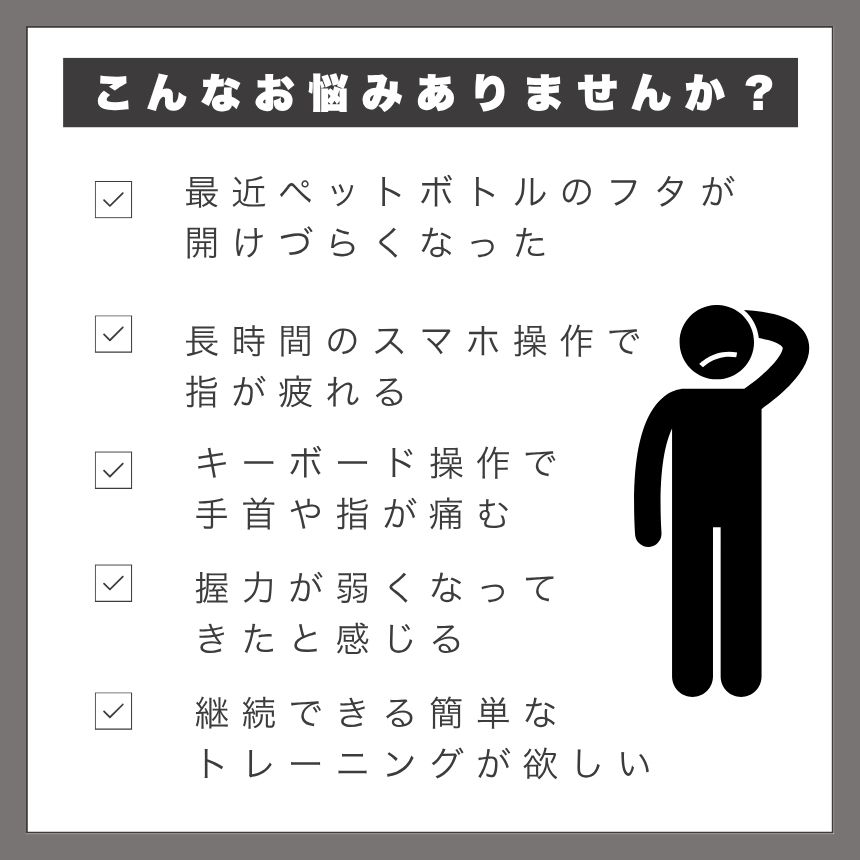 握力の衰えやスマホ・PC疲れ、冷え性、ストレスを感じている方にぴったりの「ながら運動」アイテムです。