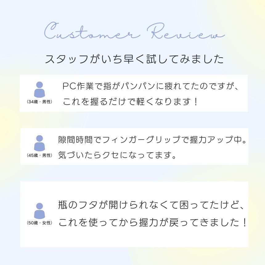 スポーツや楽器をする方、加齢による手の衰えが気になる方にも最適。実際に使った方からは