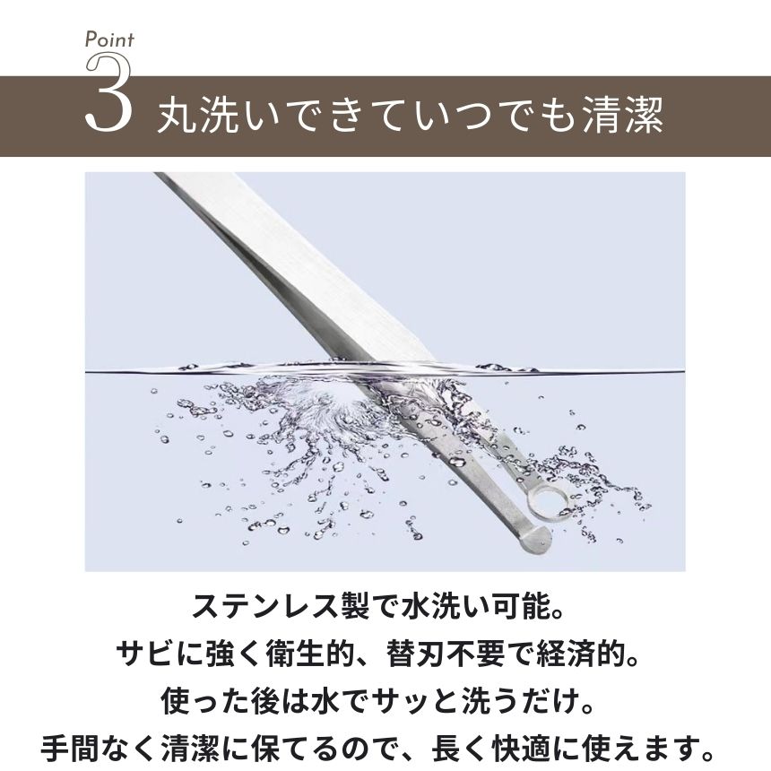 本商品は リング型ヘッド を採用しているため、肌に直接刃が当たらず、安心・安全に処理が可能。