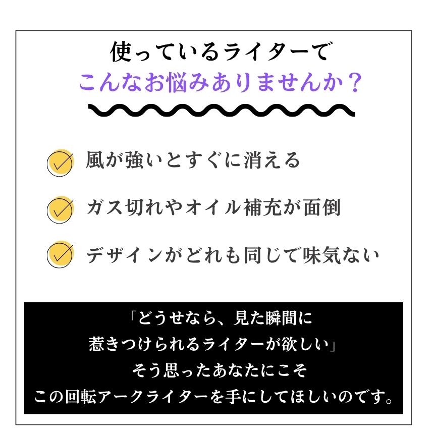 従来のライターとは全く異なる――。この回転アークライターは、まるでブラックホールのように渦を巻く回転プラズマ放電が特徴。スイッチを押した瞬間、SF映画のような光が走り、見る者を惹きつける圧倒的なデザイン性を誇ります。