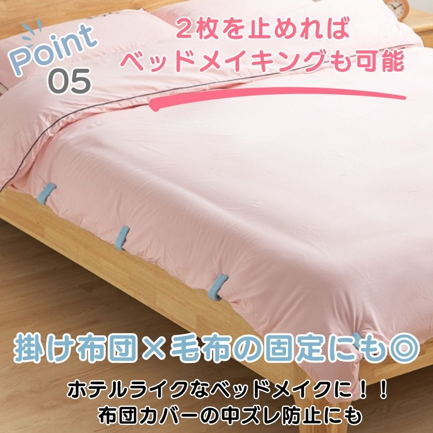 掛け布団と布団カバーの固定だけでなく、毛布同士の固定や敷きパッド・ベッドシーツのズレ防止にも対応。