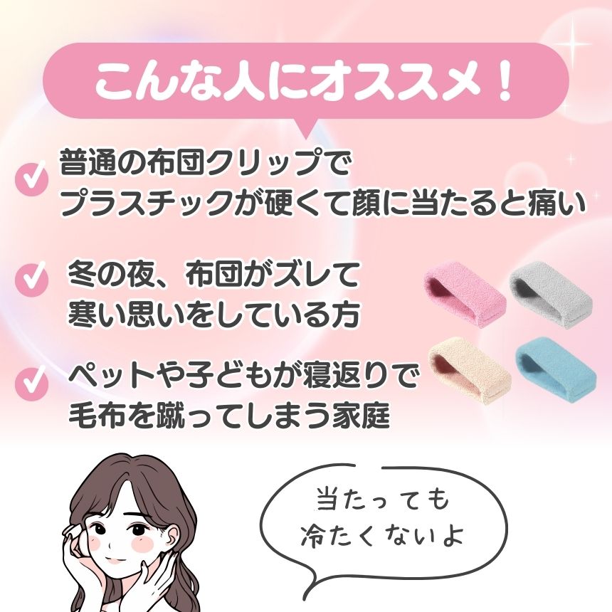 そんなストレスを解消するのが、ボア素材でヒヤッとしない布団クリップです。