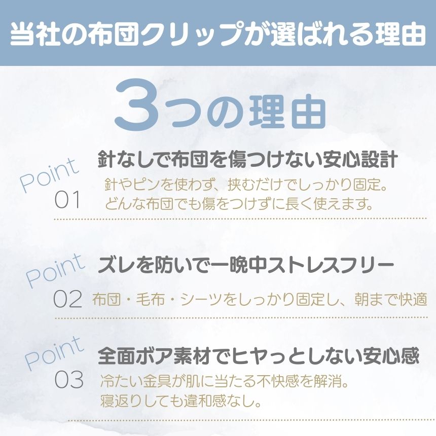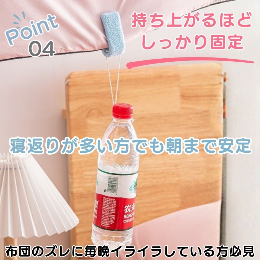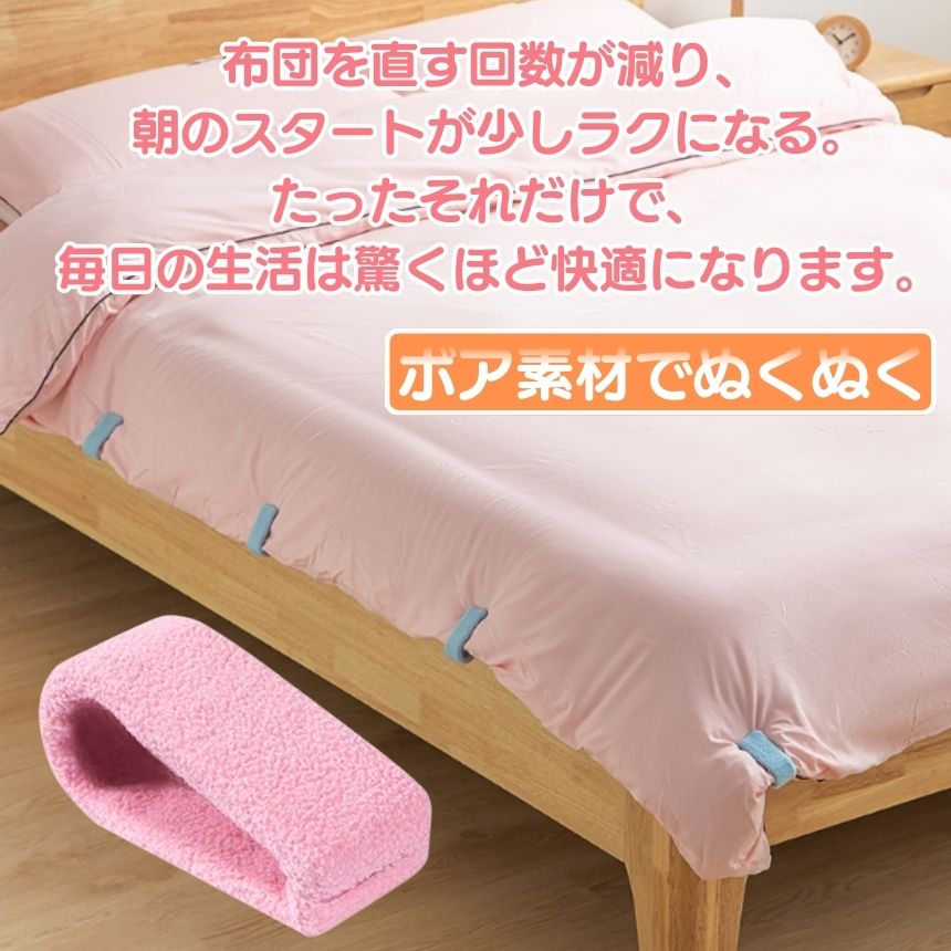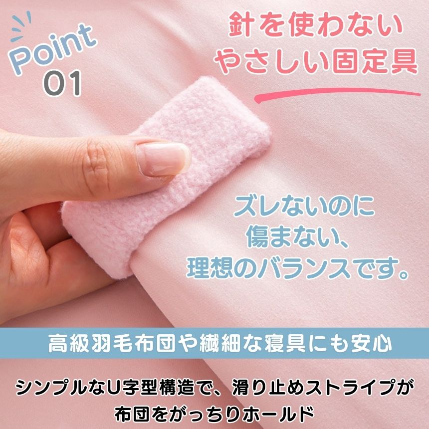布団やカバーを傷つける心配がなく、はさむだけで簡単にしっかり固定できます。