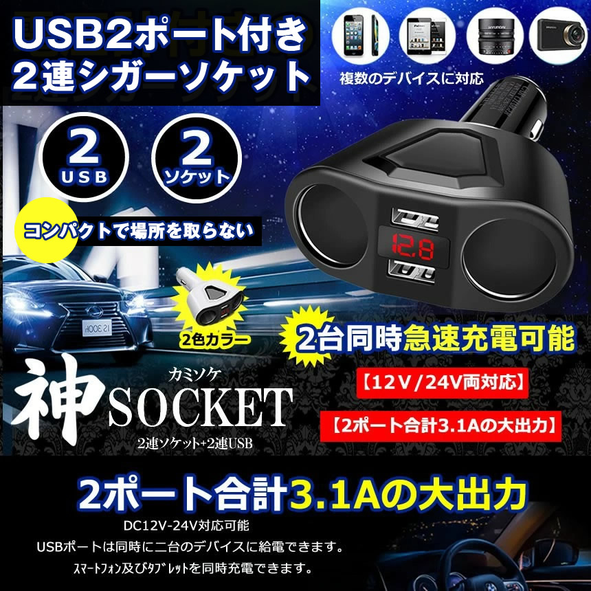 シガーソケット 2連 増設 カーチャージャー 分配器 ソケット 2 USB スマホ スマートフォン タブレット 充電 充電器 3.1A 120W ブラック ホワイト KAMISOCKET