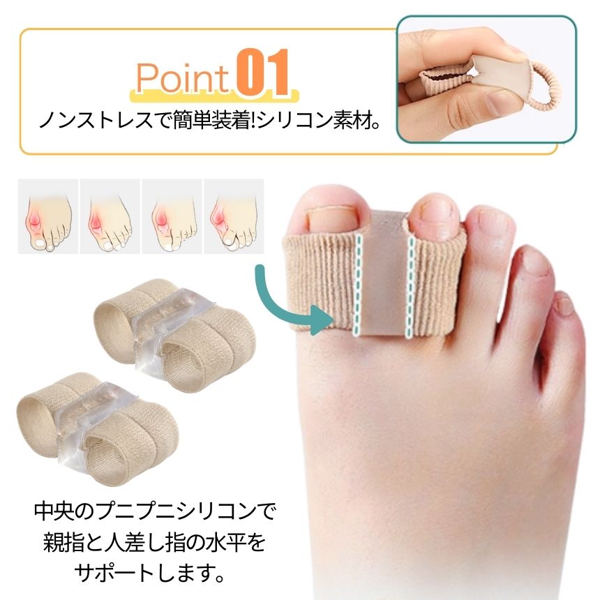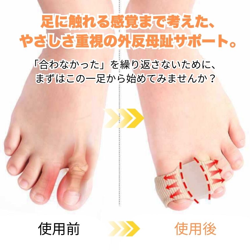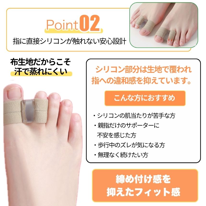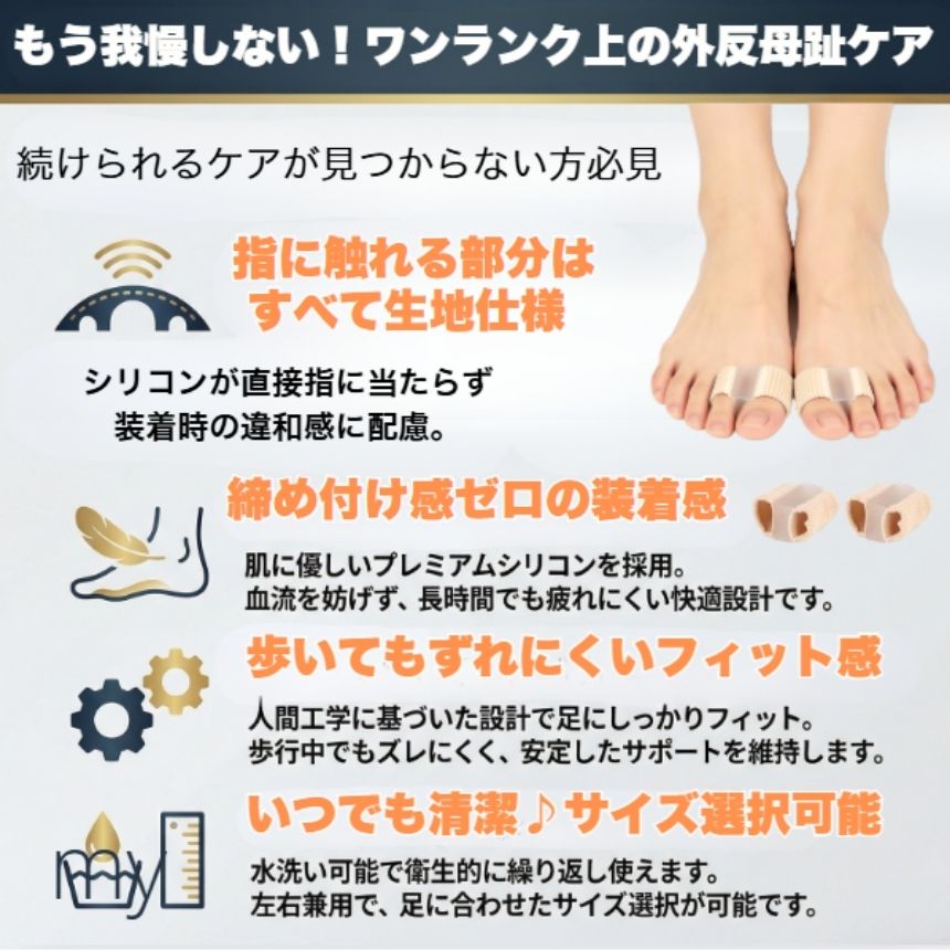外反母趾が気になり始めた方や、足元の違和感に悩む方に向けた外反母趾サポーターです。親指だけでなく人差し指にもサックを備えた設計により、装着時の安定感を意識しやすく、歩行中もズレにくい構造となっています。