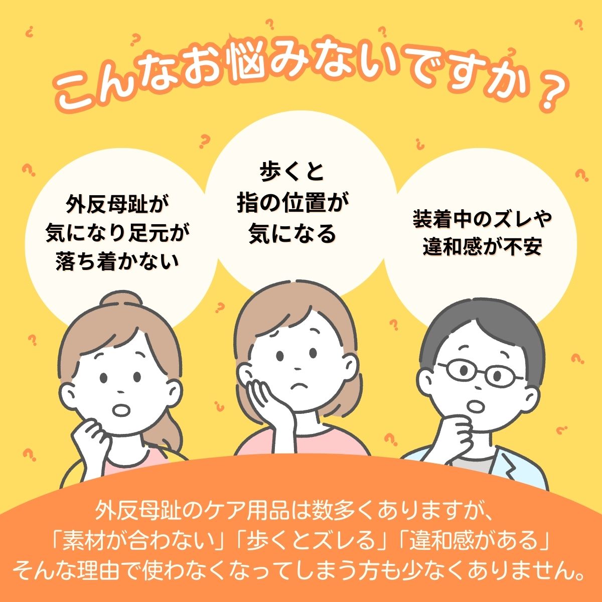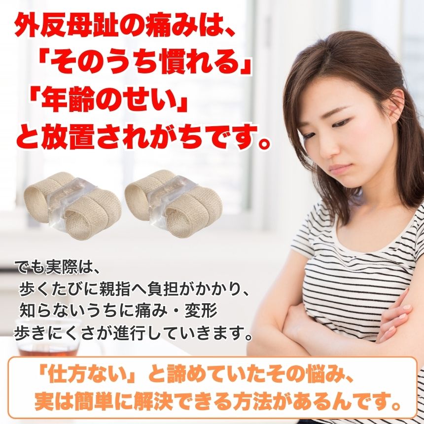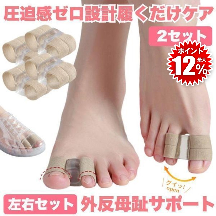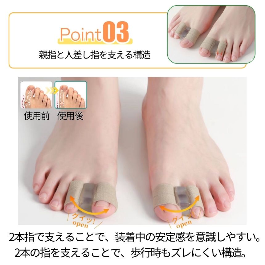 外反母趾が気になり始めた方や、足元の違和感に悩む方に向けた外反母趾サポーターです。親指だけでなく人差し指にもサックを備えた設計により、装着時の安定感を意識しやすく、歩行中もズレにくい構造となっています。