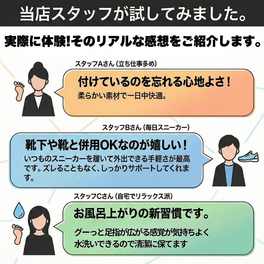 薄型デザインのため、靴下や靴の下に装着しても目立ちにくく、通勤・外出・家事など普段の生活に自然に取り入れられます。締め付け感を抑えたフィット感で、長時間の装着にも配慮しています。