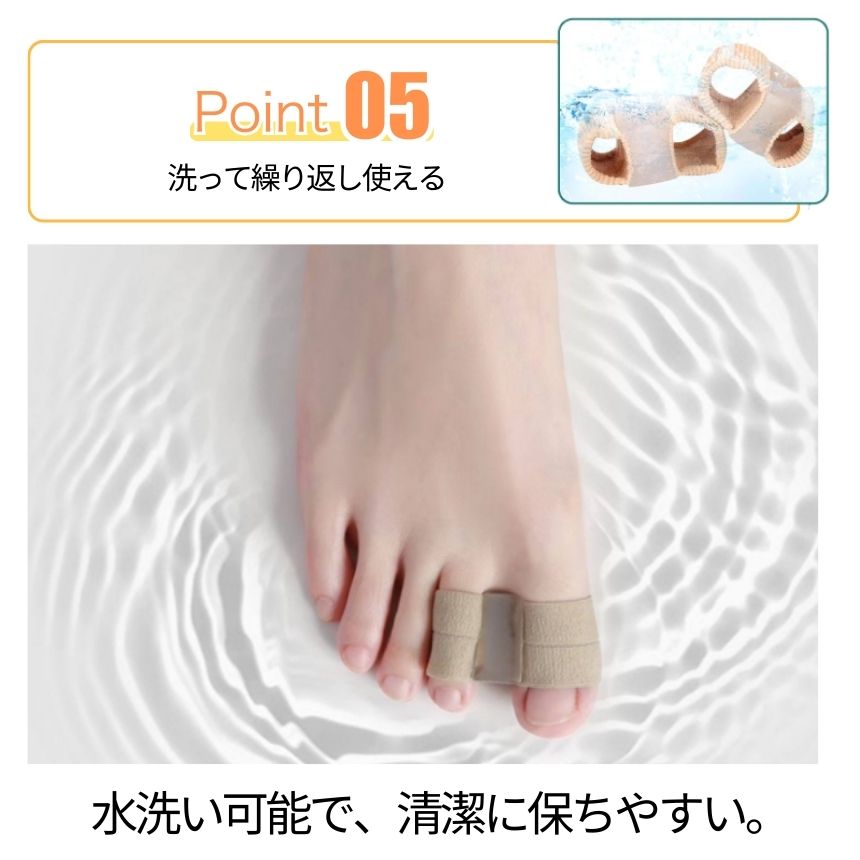 水洗い可能な設計で、繰り返し清潔に使用できるのもポイント。外反母趾が気になる方の足指ケアや、日常の足元サポートを探している方におすすめの足指サポーターです。