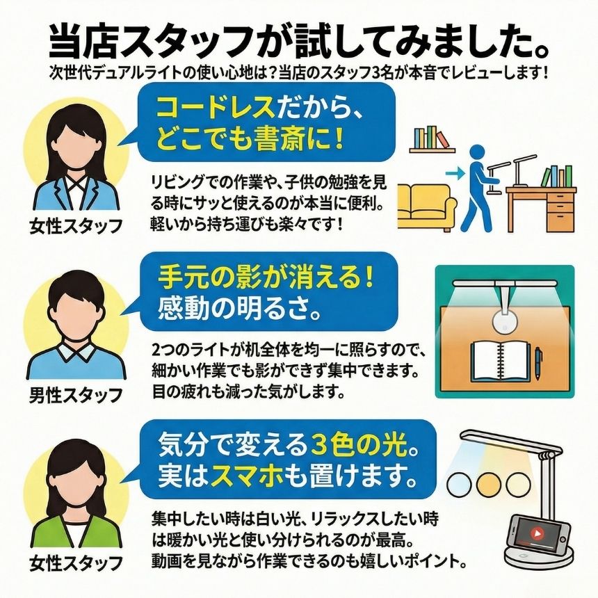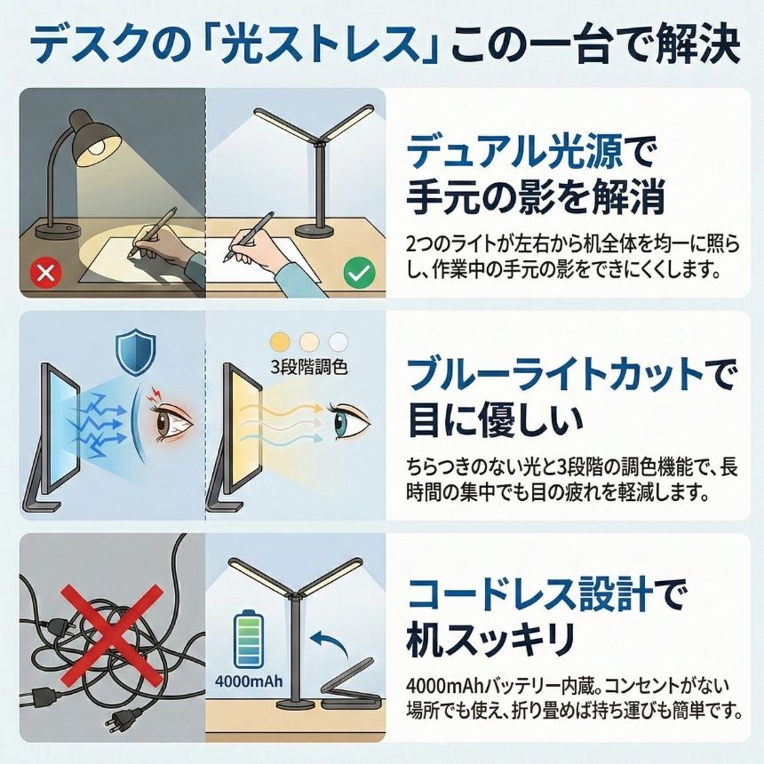 長時間の勉強や仕事で「目が疲れる」「手元が暗い」と感じたことはありませんか?