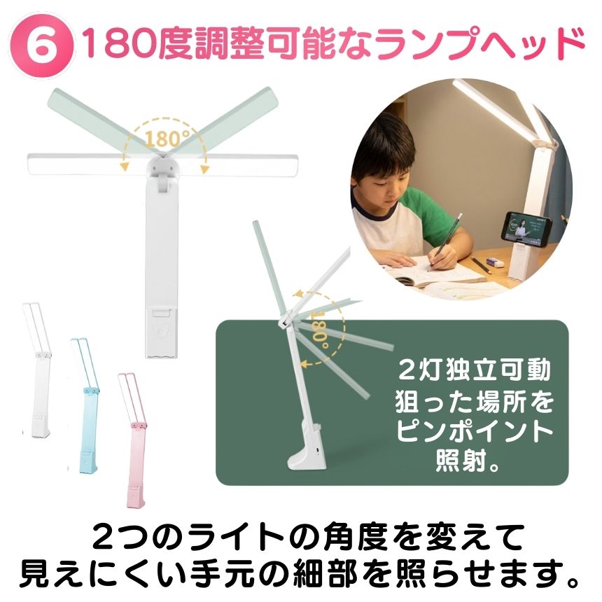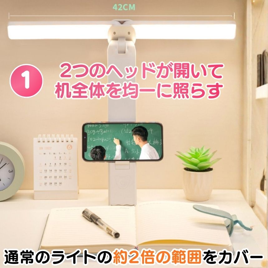 2つのランプヘッドに32個のLEDを搭載し、光を均一に広げることで、手元だけでなくデスク全体をやさしく照らします。ブルーライトを抑え、ちらつきのない光なので、読書やパソコン作業を長時間続けても目が疲れにくいのが特長です。